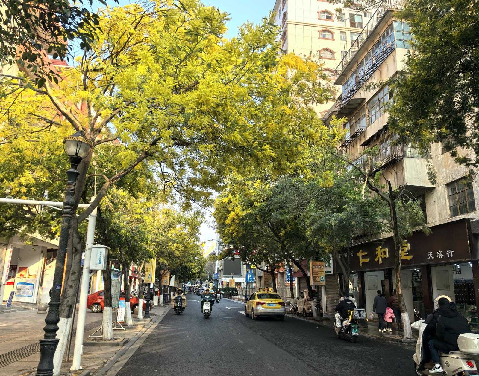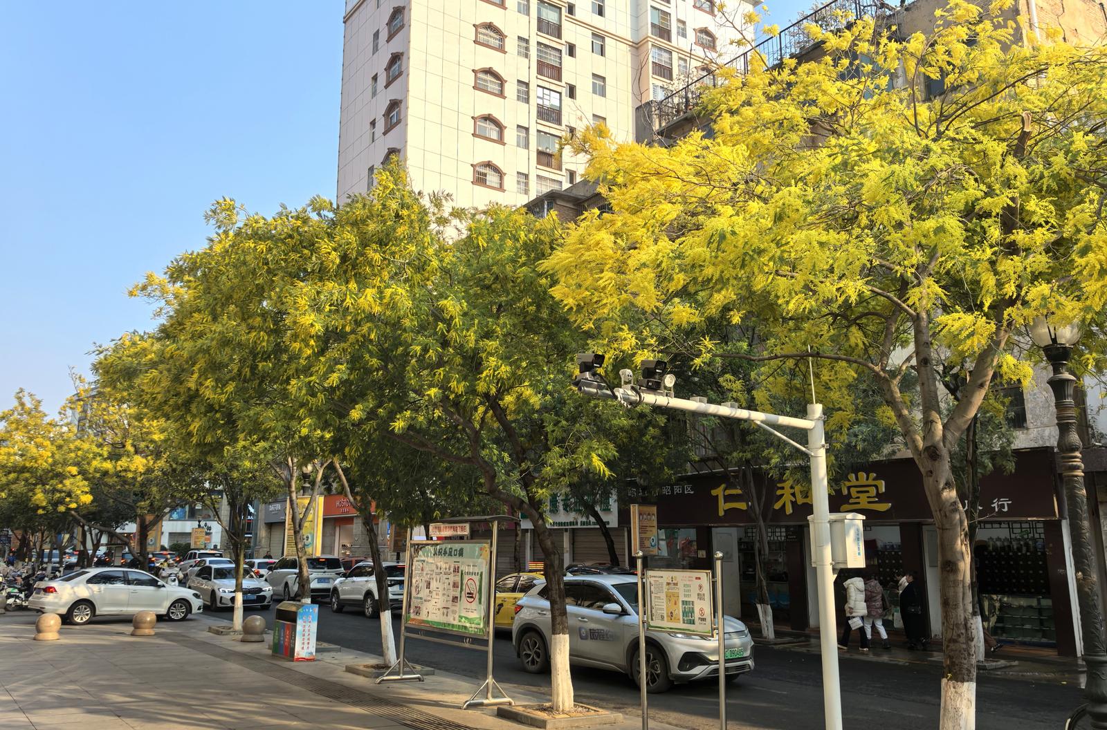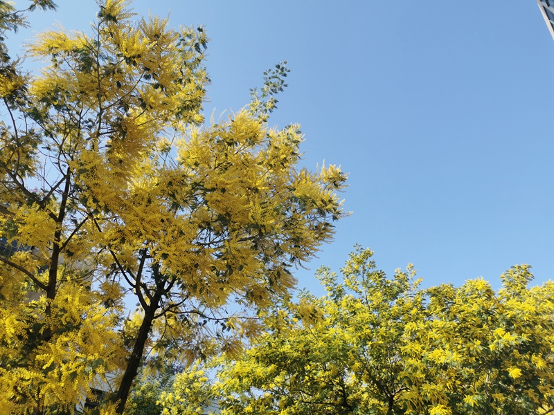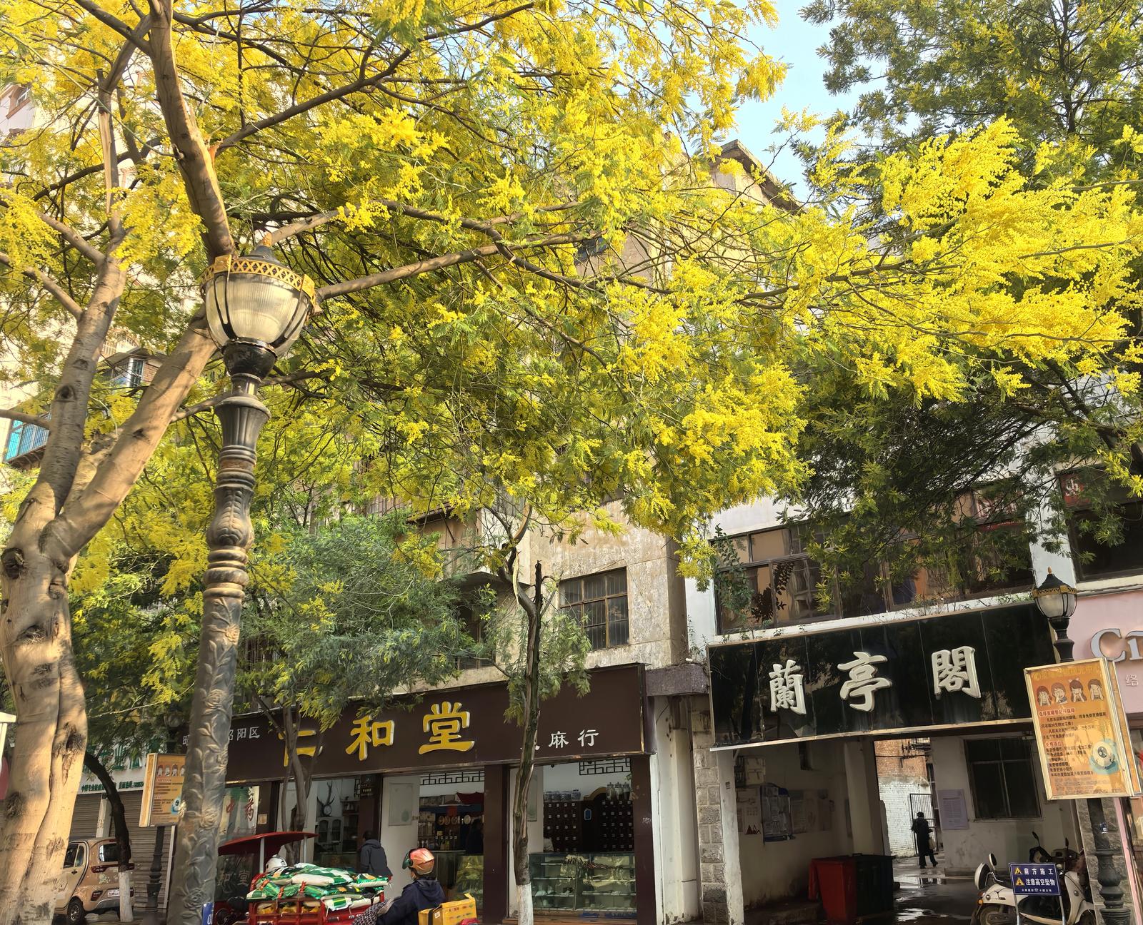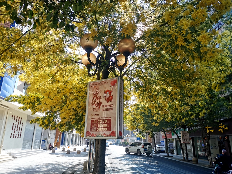 在二甲路路口放眼望去,银荆花一串串、一树树、一片片花开成海,漫步街头,淡雅的花香沁人心脾,抬头看去一簇簇黄色的小花灵动可爱。二甲路小区居民三三两两坐在树下赏春色、拉家常。行人不时驻足拿出手机拍几张照片、发一段视频,记录在二甲路偶遇的春天。在昭阳城区每条街道的春天都不一样,二甲路的春天是灿然、细腻、明艳、治愈的一片柔黄,清甜不腻、浓淡相宜,春风如你,一切刚刚好。