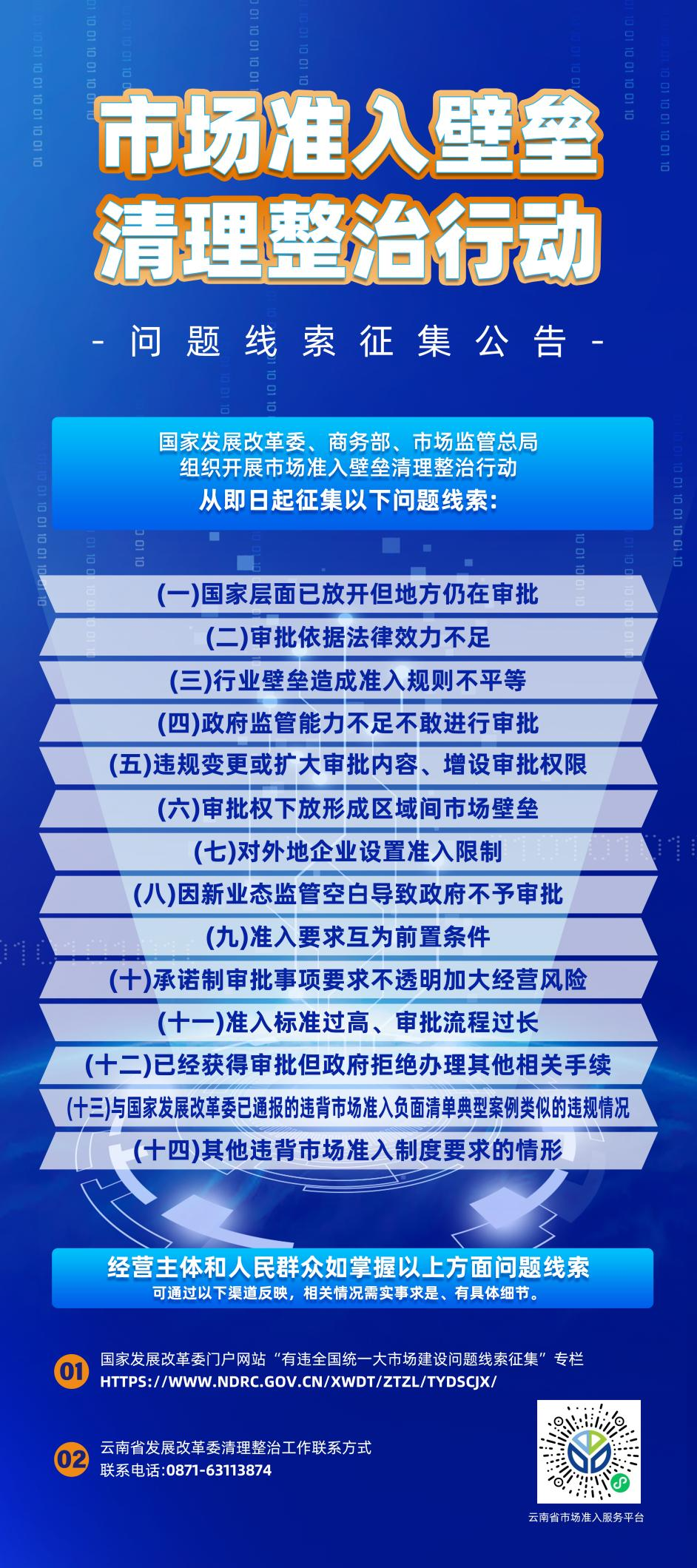 国家发展改革委、商务部、市场监管总局于2025年4月至10月组织开展市场准入壁垒清理整治行动,我局联合区工信局、区市场监管局从即日起征集昭阳区市场准入壁垒清理整治行动问题线索,现就有关事项公告如下: