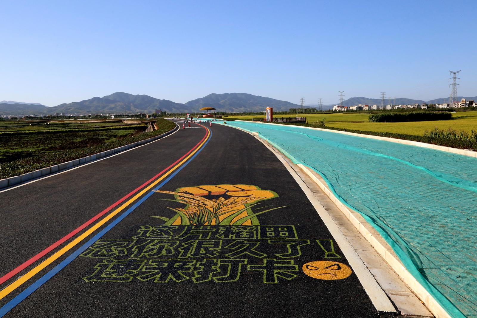 沿着观光大道前行,路旁是一望无际的金色稻田,道路上绘制的荷花、稻穗等农耕元素图案,搭配“冲,荷塘边的快乐不要钱”等趣味标语,充满了生活气息。观景台上,“稻丰景好,畅游正好”“镜头藏金、稻间拾光”“稻浪滚滚、趣游田间”等兼具诗意与文化感的文案,更让公园增添了几分雅致。