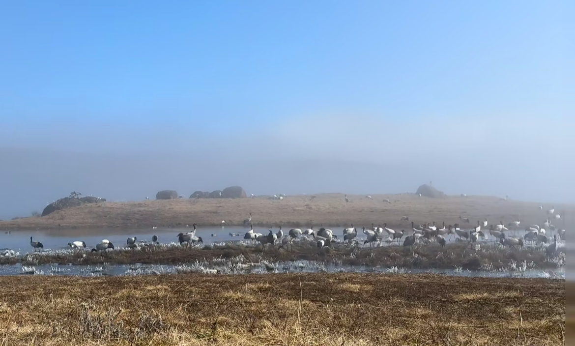 自11月13日10只黑颈鹤作为“先头部队”飞抵大山包开始,大山包黑颈鹤国家级自然保护区越冬候鸟迁徙潮就持续不断,截至11月19日,虽受大雾等气候影响,但保护区工作人员已监测到黑颈鹤的数量突破300只。与此同时,斑头雁、赤麻鸭等各类水鸟也纷纷前来越冬,总数超过1000只。