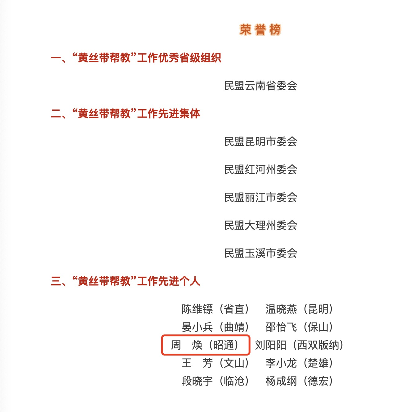 近日,民盟中央、司法部在重庆联合召开“黄丝带帮教”工作40周年座谈会,对“黄丝带帮教”工作先进集体和个人进行了表彰。政协昭阳区第六届委员会常务委员、云南凌云(昭通)律师事务所副主任周焕凭借在“黄丝带帮教”工作中的扎实付出与突出贡献,荣获民盟中央“黄丝带帮教”工作先进个人称号。