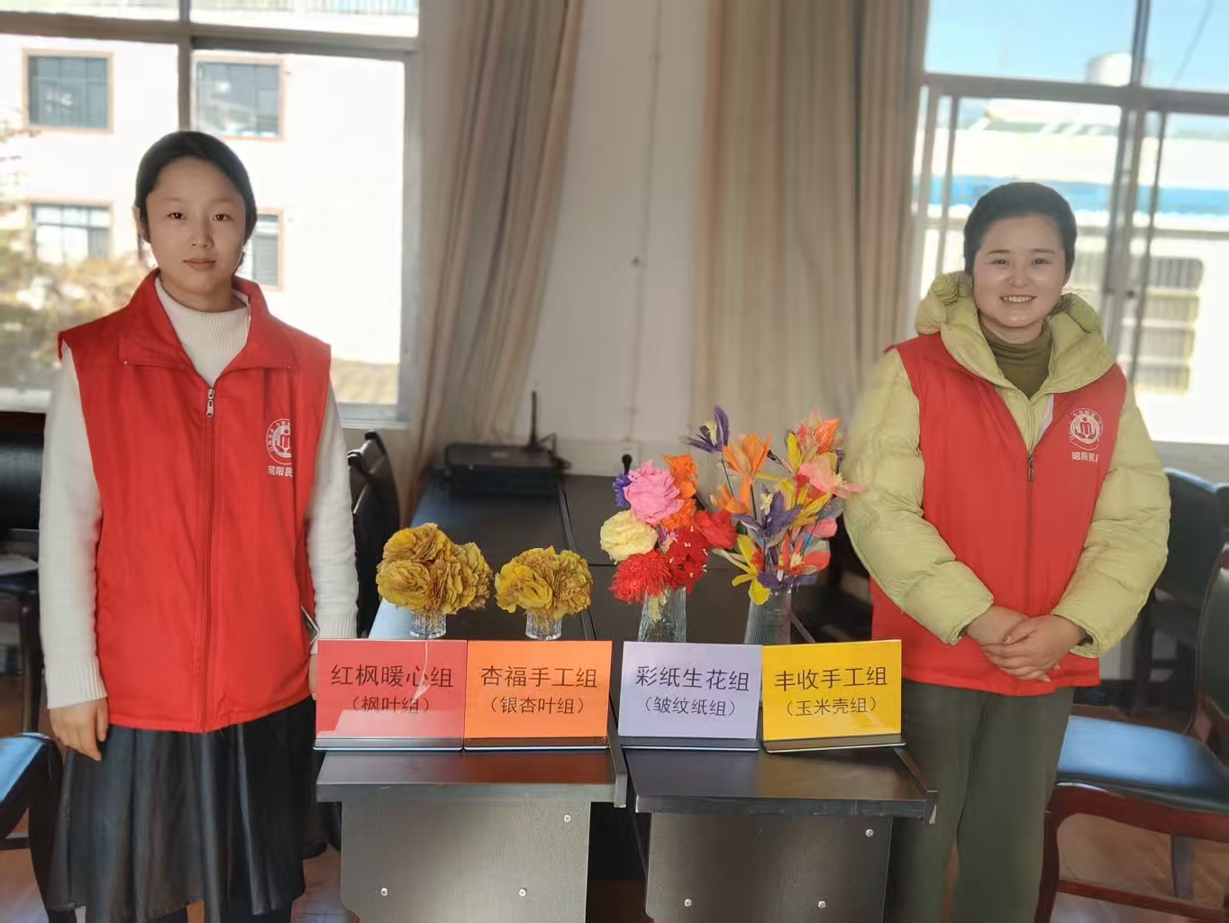 活动延续首期小组契约,通过“手工心愿单”收集老人建议,选用枫叶、银杏叶、玉米壳等本土材料,设立4个特色小组。老人们投票选出组长后,分组投入创作:银杏叶组将落叶制成精致花束,玉米壳组把农作物废料转化为创意手作,枫叶组合力完成寓意团结的“我们的百花园”主题作品,皱纹纸组则以简单创作帮助内向老人打开心扉。