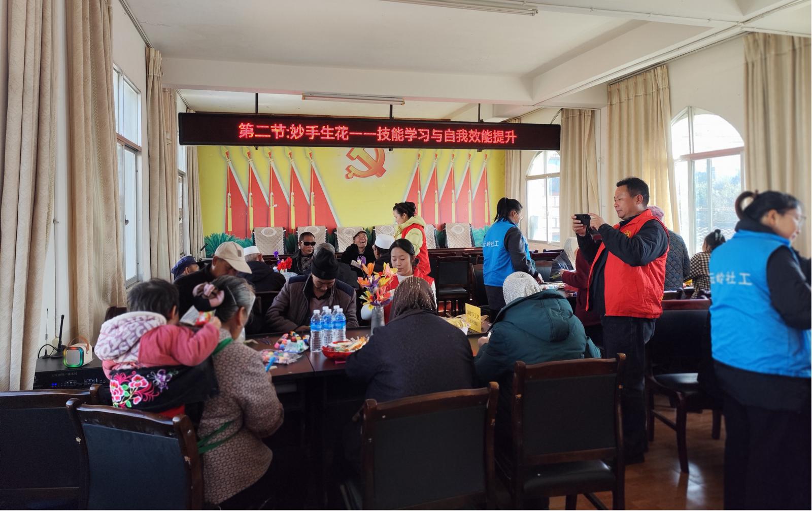 近日,昭阳区守望乡社工站到水井湾社区开展第二期“妙手生花”手工兴趣活动,以本土材料为社区30名老年人搭建邻里互动平台,进一步丰富社区老年人精神文化生活。