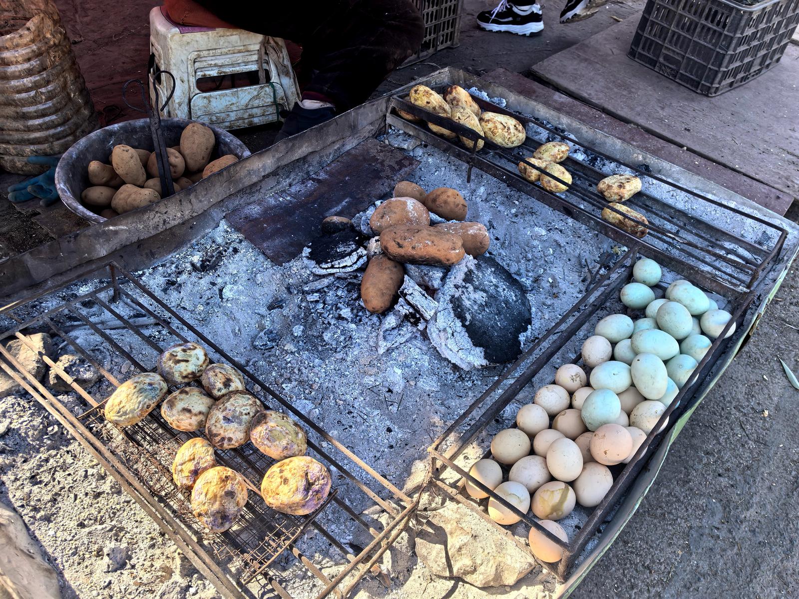 五六个摊位沿路而设,黄澄澄的洋芋现刮现烤,搭配昭通酱、花生辣椒酱、凉拌折耳根等30余种特色佐料,满足食客多样口味。黄心洋芋每市斤五至六元,大山包小黑洋芋每市斤六至七元,价格亲民,摊主还常多送一个。除烧洋芋外,摊位还供应鸡蛋、烧玉米。据摊主介绍,日均收入约两三百元,烟火气中透着朴实生意人的满足与热情。