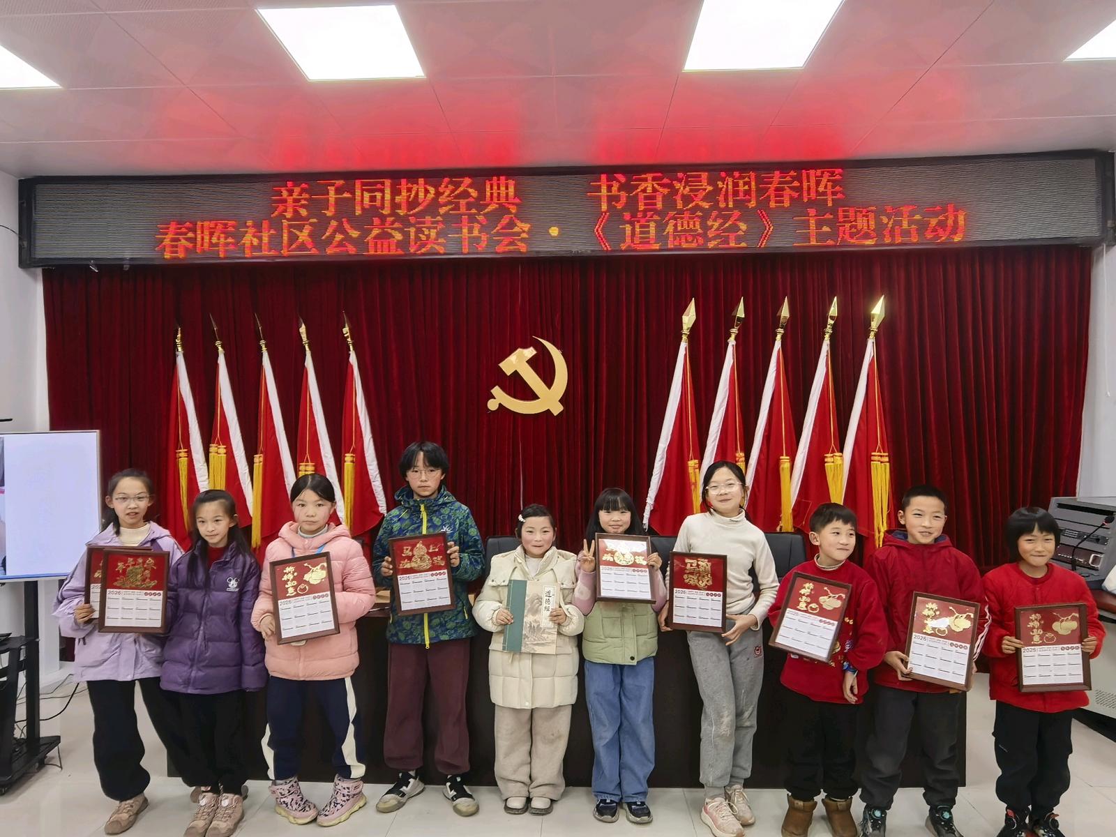 随后,参与家庭依照打卡标准进行了首次摘抄。现场评选出2位优秀家长与4名书写工整的小朋友,并为他们颁发书籍作为奖励。本次活动吸引了社区内17名儿童与16名家长自愿报名,组成亲子共读学习小组,打卡周期将持续至2026年12月20日。摘抄内容要求选自《道德经》原文,《道德经》作为中华传统文化瑰宝,蕴含深刻的人生哲理与处世智慧。每日不少于100字,书写需工整规范,并鼓励用三色笔标注重点、撰写简短感悟,强调在“抄”中重“悟”,培养独立思考能力。