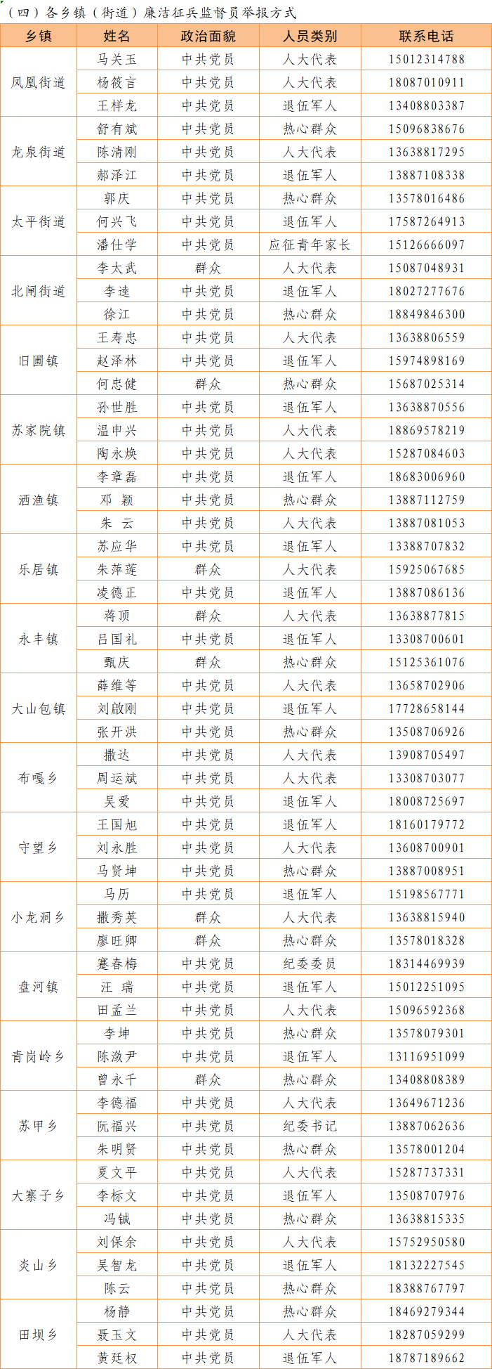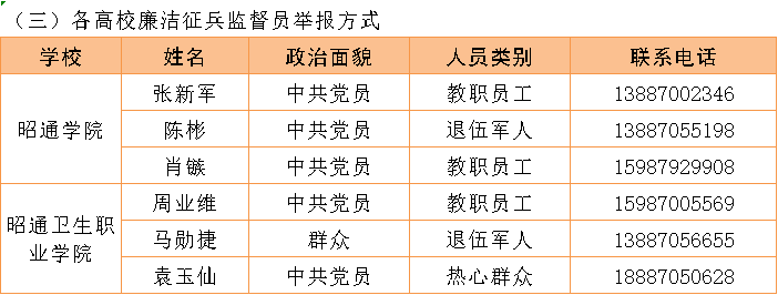 2026年征兵工作已经全面展开,为深入贯彻党风廉政建设有关要求,严明征兵工作纪律,筑牢廉洁征兵底线,维护广大应征青年的合法权益,保证征兵工作公开、公平、公正,经昭阳区人民政府征兵办公室会同相关部门进行资格审核,现公布7名区级和63名乡镇(街道)、高校廉洁征兵监督员信息。欢迎社会各界对昭阳区征兵工作进行监督,发现问题线索,可拨打电话举报(或发送举报邮箱),一经查实将严肃处理。