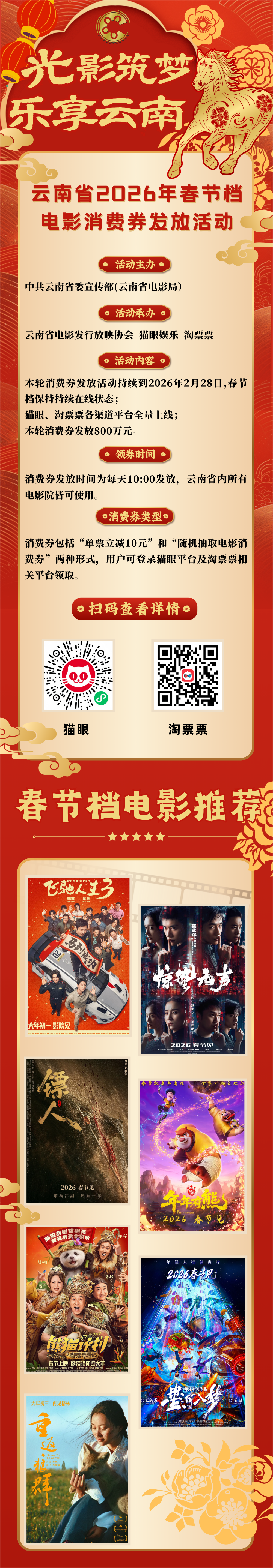 为丰富2026年春节群众文化生活,激活电影消费市场活力,推动电影与文旅深度融合,由中共云南省委宣传部(云南省电影局)主办,云南省电影发行发映协会、猫眼娱乐、淘票票承办的“乐享云南 光影筑梦”春节电影消费促进活动正式启幕。活动推出800万元电影消费券及多重支付优惠,联动全省多地打造“电影+”多元消费场景,以光影为媒营造“到云南、过春节、看电影”的浓厚氛围,为春节文旅消费市场注入新动能。