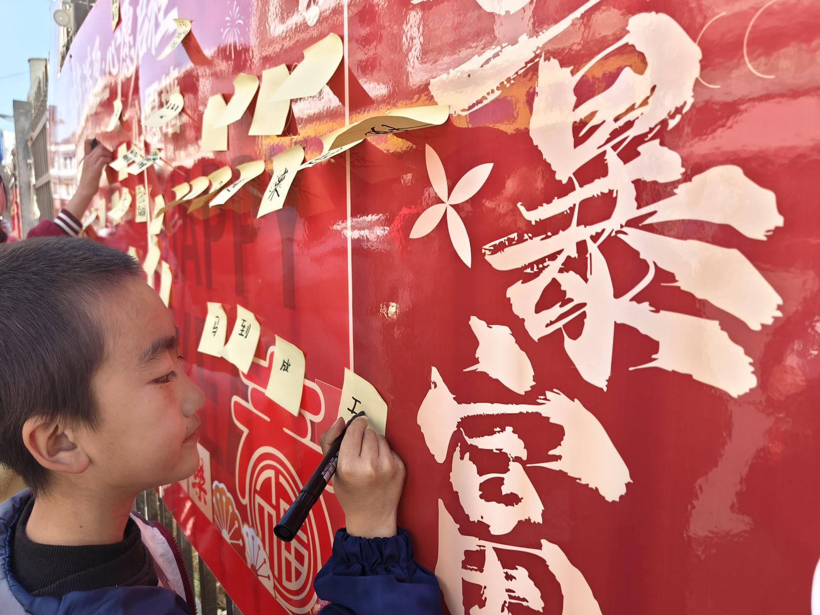 福气满盈·心愿启程。“新春心愿墙”前,往来行人写下新春心愿,有人希望中考顺利,有人祈愿马到成功,有人祝福家乡越来越好,一名79岁的老人一笔一划写下“风调雨顺、国泰民安”……心愿如星火缀满长墙,映照出最朴素的民生期盼与最坚韧的共同体信念。