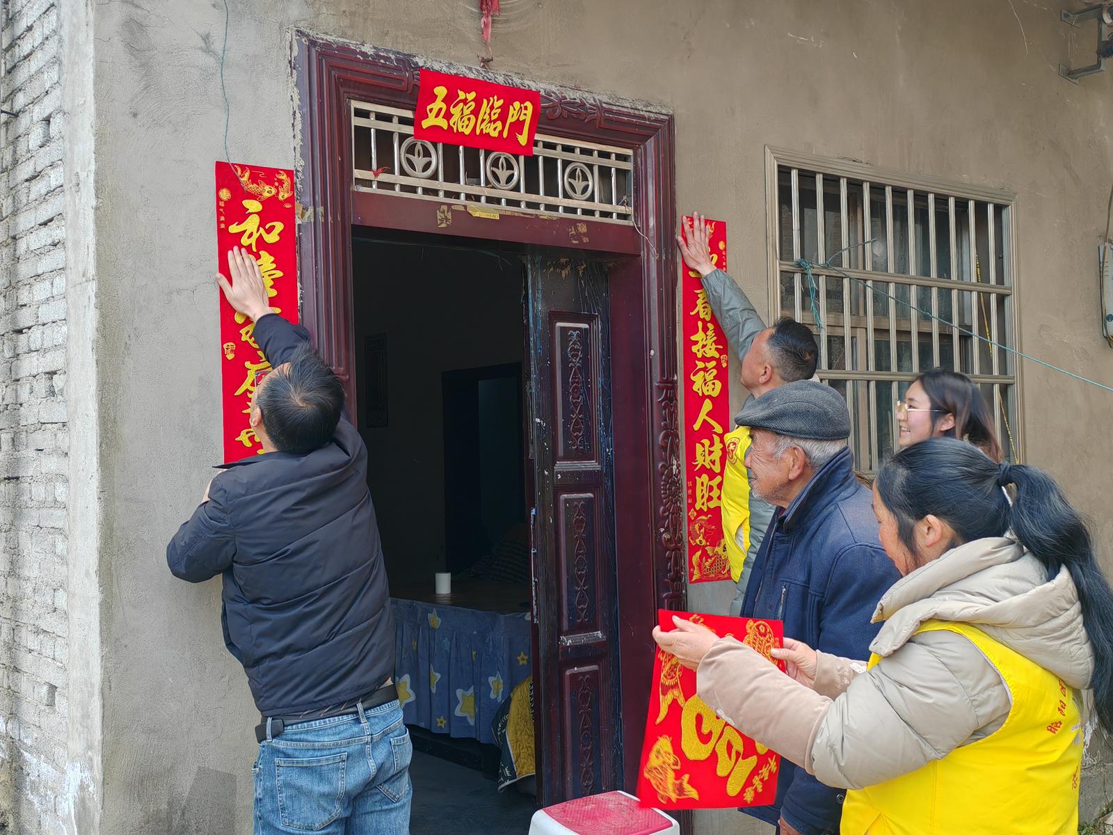 “大爹,给在屋头?”村支书王庆珍轻轻叩响81岁独居老人李世华的家门。门“吱呀”一声开了,老人的脸上挂着笑意。村干部王大军递上春联:“快过年了,我们来给您贴对联,祝您马年身体健康、吃好睡好!”话音未落,大伙儿便忙开了——有人揭下去年泛白的旧春联,有人用湿布抹净门框,有人展开对联,比画着高低。
