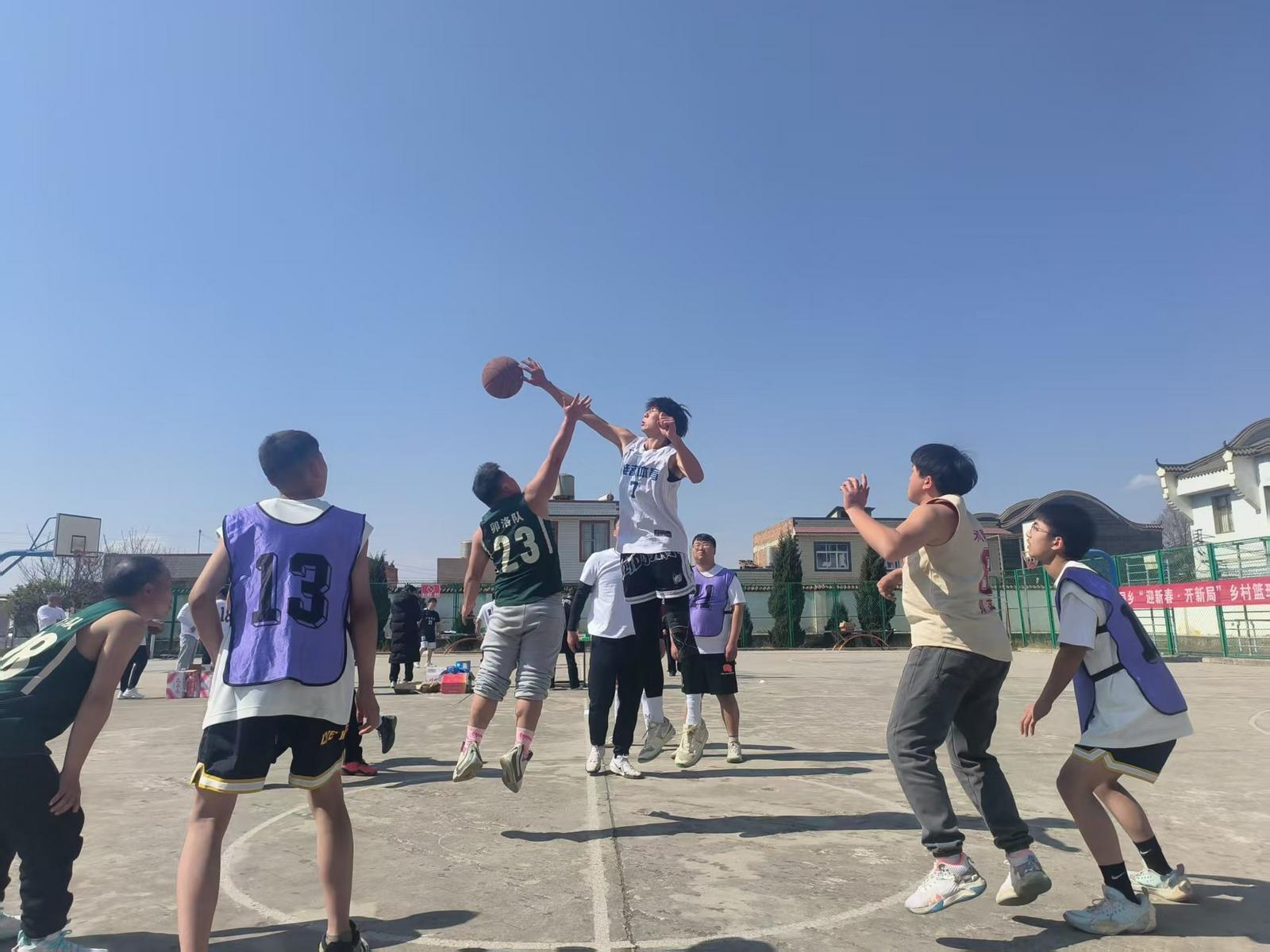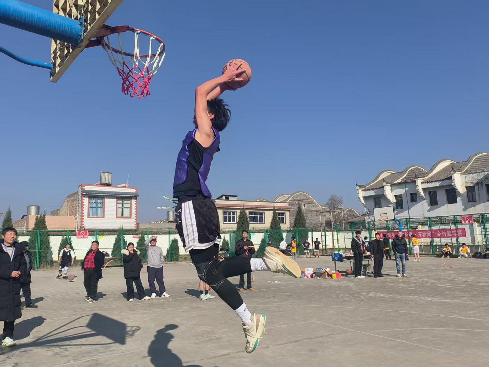比赛现场气氛热烈非凡,篮球撞击地面的“砰砰”声、清脆的哨音与观众席上此起彼伏、掌声交织回荡。运动员们奋勇拼搏、配合默契,运球、传球、投篮一气呵成,每一次跃起扣篮都迸发着青春的热力,每一次精准传球都传递着信任的温度,每一次突闪救球都闪耀着坚韧的光芒。汗水浸透球衣,笑容写满脸庞,胜负之外,是乡亲们久别重逢的亲切寒暄,是青年学子与父辈并肩挥洒的青春热血,更是乡土认同在奔跑跳跃中悄然扎根、蓬勃生长。