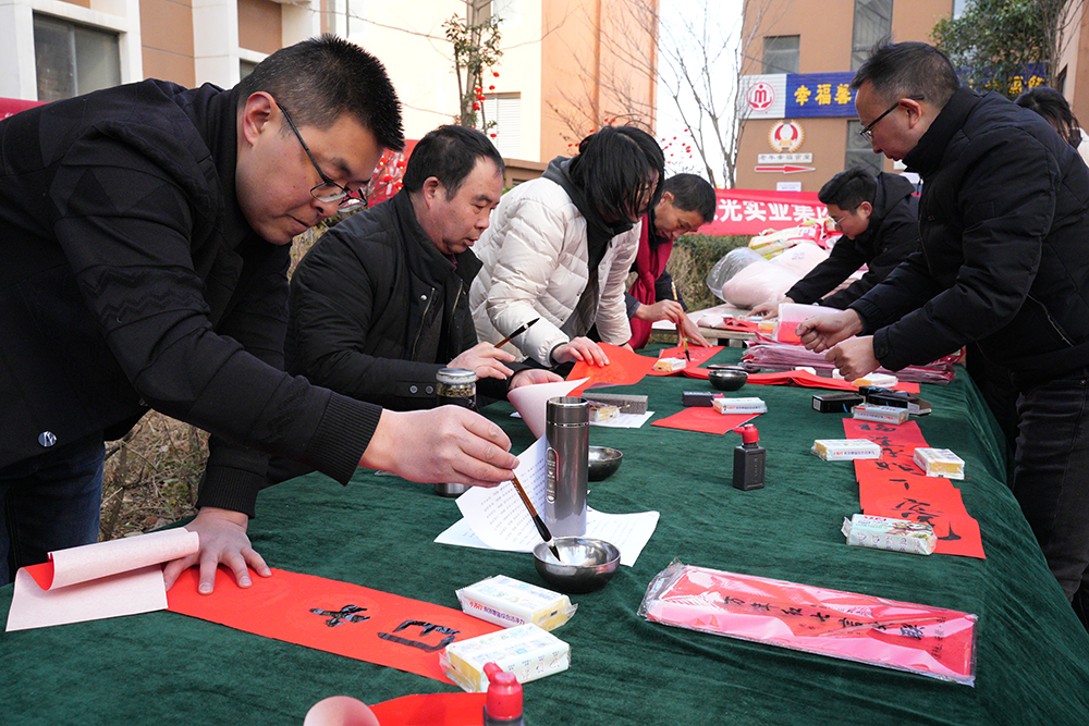 随后,社区苗族同胞身着盛装带来民族舞蹈,舞姿优美、风情浓郁;老年文艺队献上自编自导的扇子舞,展现出昂扬向上的精神风貌;小朋友们带来手语舞《感恩的心》,用真挚的表演感谢社会各界对社区发展的关心与支持。联系单位的书法爱好者现场挥毫泼墨,书写春联福字,为居民送上新春祝福,领取春联的群众络绎不绝,现场年味十足。