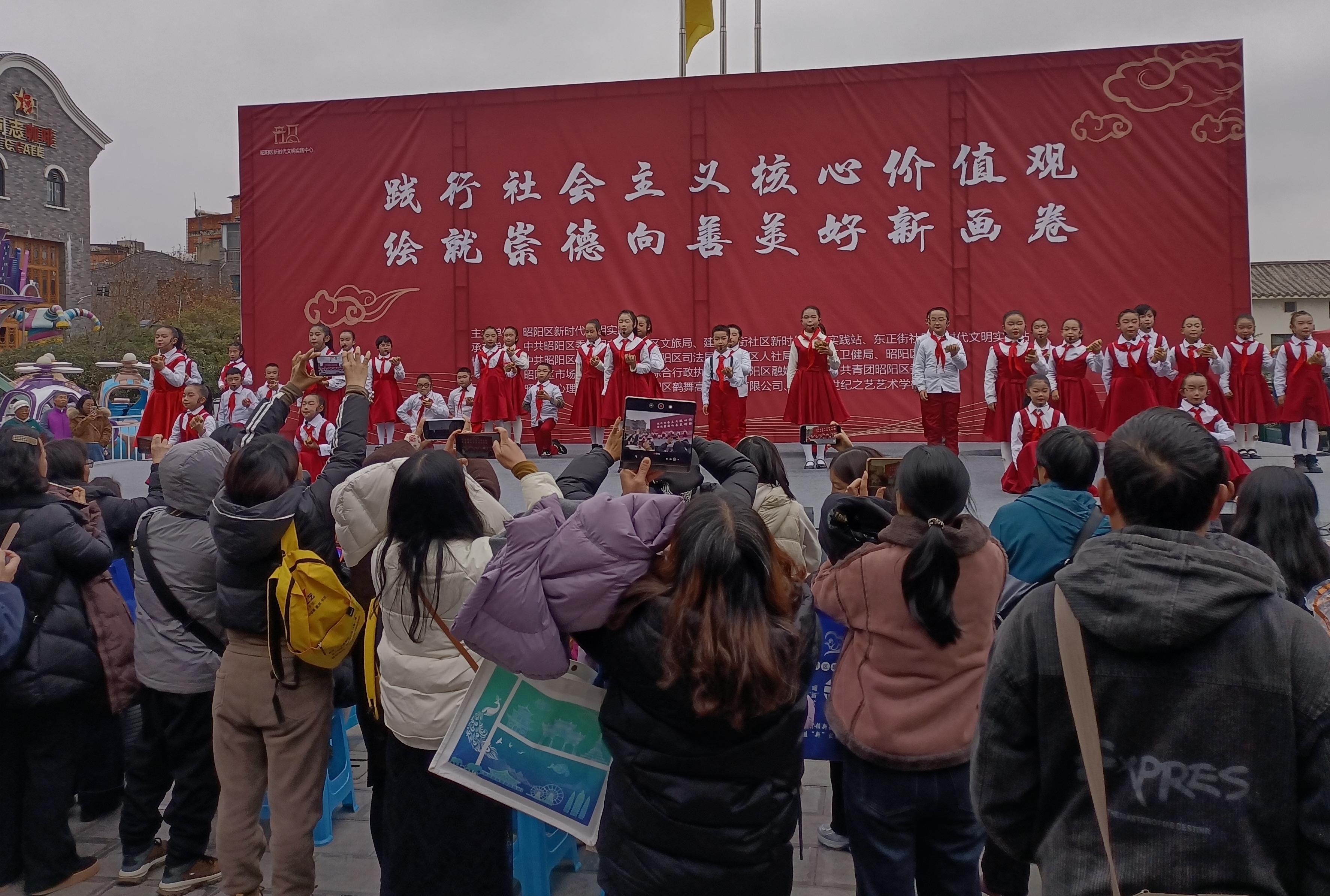12月20日,昭阳区2025年“践行社会主义核心价值观绘就崇德向善美好新画卷”文明实践活动在抚镇门广场举办,一场融合了精彩文艺表演与惠民服务的文化盛宴,在冬日里为市民带来了温暖与启迪,生动展现了昭阳区精神文明建设的丰硕成果与蓬勃活力。