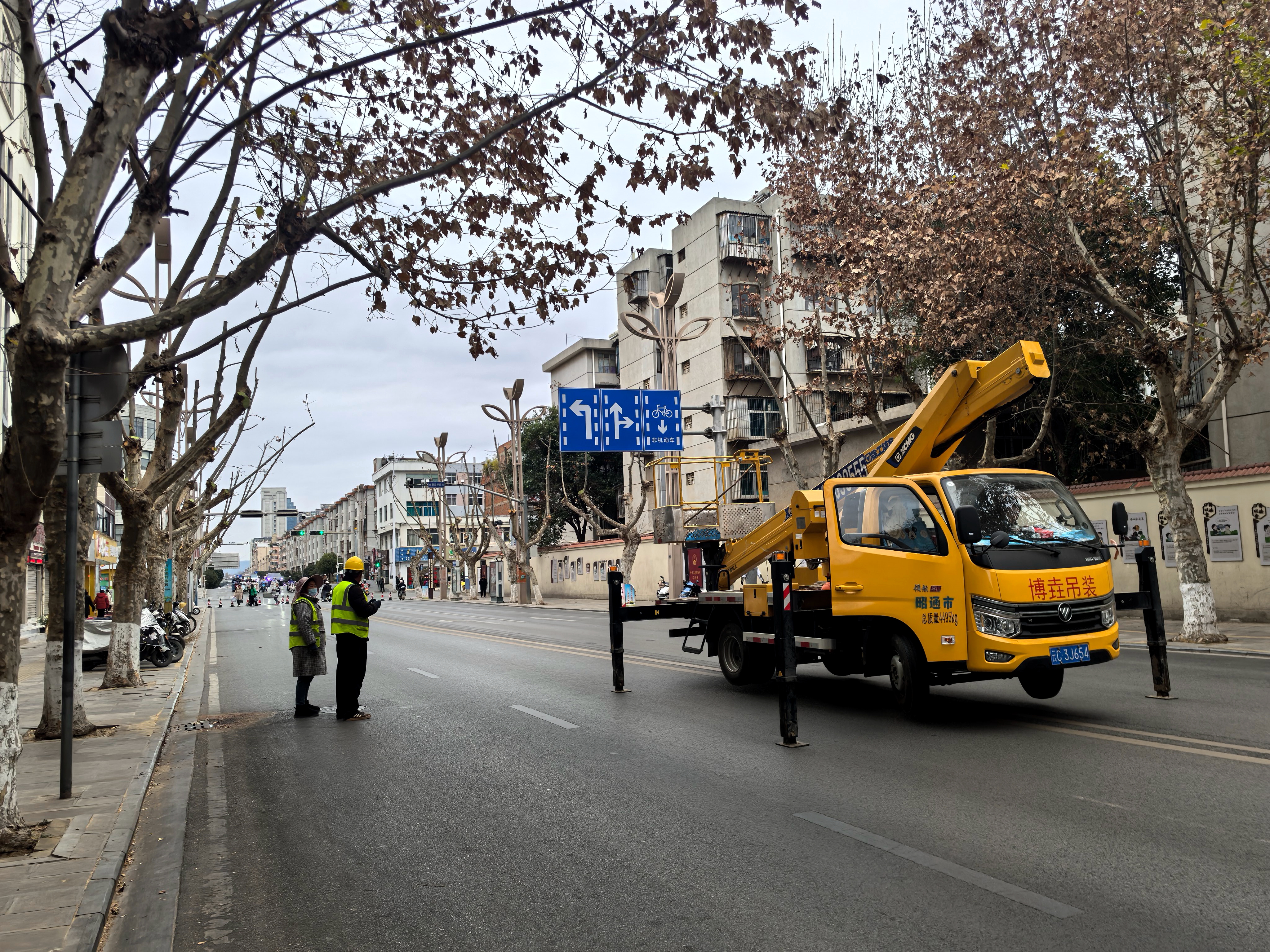 昭阳区团结路梧桐“理发”进行时:两日封闭修剪 车辆需绕行